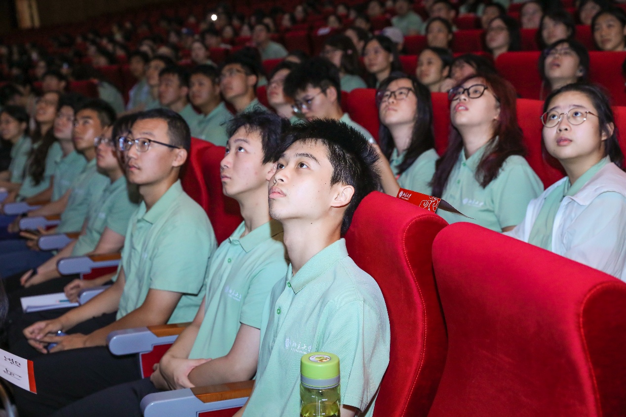 Faculty and students watched a welcome video together. The shifting scenes captured warm moments of the Class of 2025’s first steps into Peking University campus: from beaming smiles and photo opportunities at the registration site, to attentive listening and lively discussions during orientation activities, and multilingual greetings from faculty and students of various language departments... The video preserved precious snippets of the new students converging from all directions by the side of Weiming Lake, evoking a sense of boundless anticipation and belonging among the attendees.
