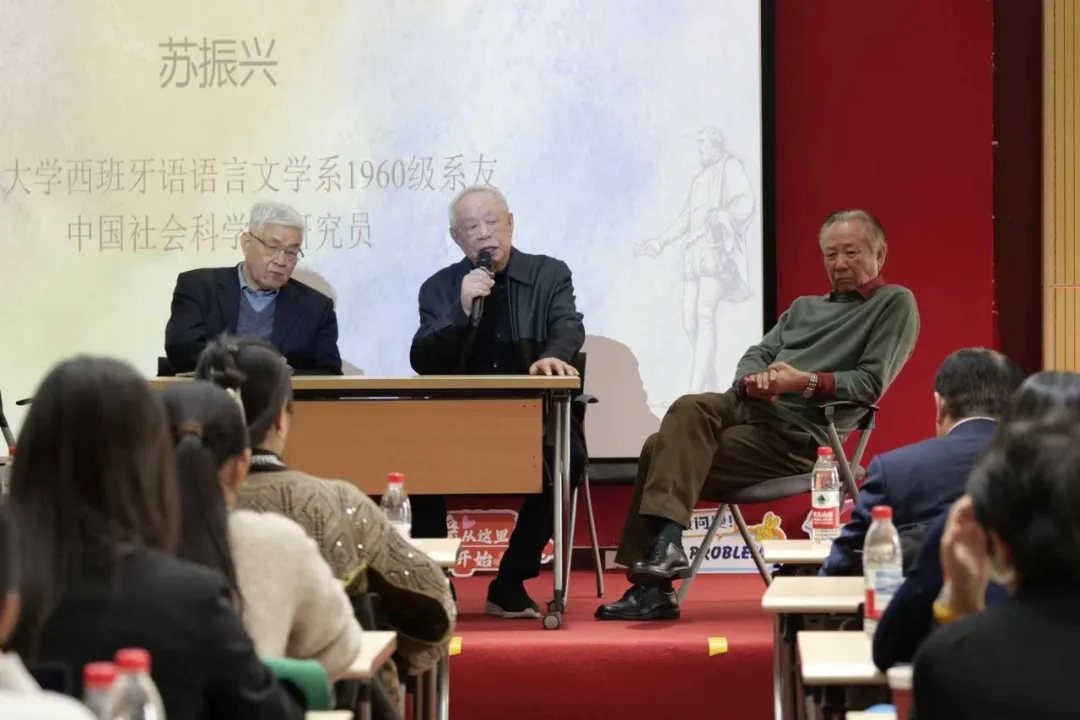 Su Zhenxing, Xu Shicheng, and Zhao Zhenjiang sharing stories from the 1960 class, the first cohort of PKU Spanish majors.