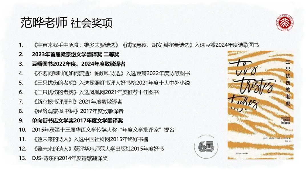 The following sections showcase the achievements of the Department of Spanish at PKU’s School of Foreign Languages in recent years, covering awards, monographs, translations, papers, research projects, and student research activities. Please note that the information compilation is ongoing, and we appreciate your understanding.