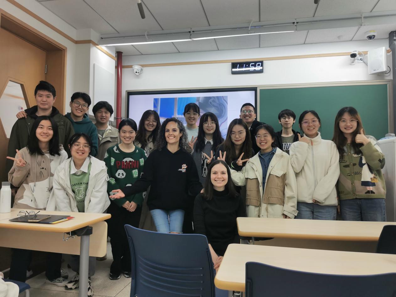 在教学过程中,安娜也不断尝试将课堂延伸至更真实的语言使用场景中。她所教过的学生如今仍能回忆起无数美好画面:在《葡萄牙语写作》课上,为了让大家练习环境描写,安娜把同学们带出教室,走进燕园的春色中,在五四路、未名湖边观察和记录;在《葡萄牙语(六)》课上,安娜曾邀请她的朋友,在《流浪地球2》中出演巴西宇航员的女演员Daniela Tassy走进课堂与同学们交流。这一切都是为了摆脱传统语言教学的枯燥感,让同学们在真实互动中检验所学语言。这些尝试让学生意识到,语言并非只存在于课本之中,而是始终与具体情境和交流对象相连。