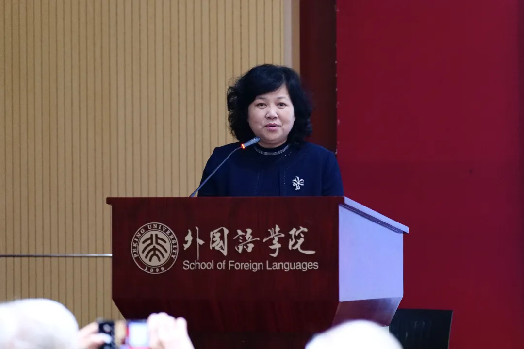 北京大学外国语学院党委书记李淑静代表学院致辞,祝贺北大西语专业成立65周年,期望西语系继续坚守育人初心、勇于创新融合、深化国际交流,再创辉煌。