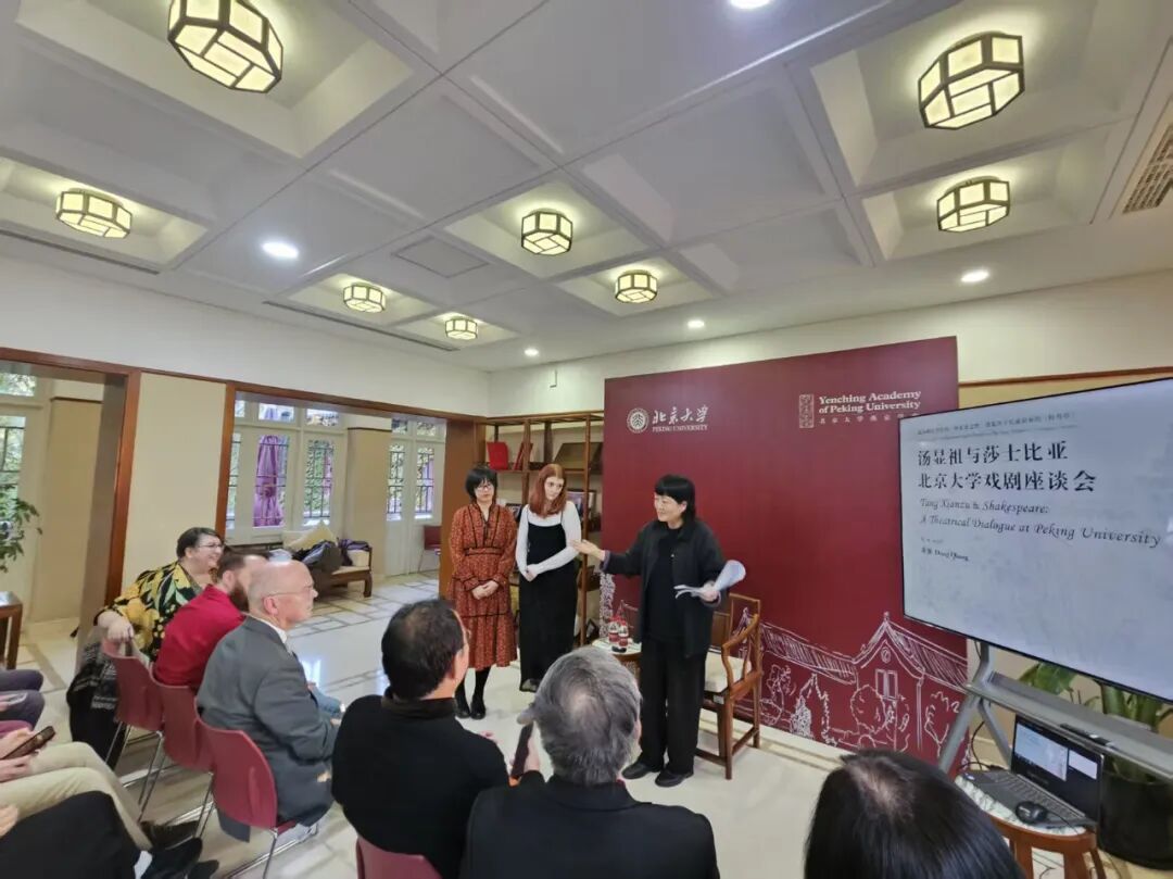 为了纪念习近平主席倡导中英两国学者和艺术家共同纪念汤显祖和莎士比亚逝世400周年的讲话发表10周年,北京大学外国语学院、北京大学燕京学堂、北大国家语言文字推广基地、南京大学高研院莎士比亚中心联手,选择10月27日,共同举办了一场别开生面的北大戏剧交流和演出活动。这次活动邀请到来自英国莎士比亚故乡的莎士比亚研究院的师生一行8人,他们在参加了江西抚州举行的第七届汤显祖戏剧节后,专程来到北大,带来了一场别开生面的莎士比亚诗体《牡丹亭》,与北大燕京学堂的同学们精彩表演的莎剧《仲夏夜之梦》在舞台上交相辉映,使得这次在北大举行的中英戏剧交流活动格外引人注目。10月27日下午,北大外国语学院和北大燕京学堂在静园三院举行了中英戏剧交流座谈会,邀请来访的英国剧组成员与北大燕京学堂剧组共聚一堂,研讨当今戏剧创作与观众审美等问题,交流莎剧排练和演出心得。出席会议的有外国语学院党委书记李淑静教授、副院长王丹教授、作为主办方之一的南京大学高研院莎士比亚中心主任从丛教授、浙江大学求是特聘教授、长江学者、浙江大学人文学部副主任郝田虎教授、中莎会秘书长、清华大学刘昊副教授。北大英语系刘红中副教授和梅申友副教授等师生也参加了座谈会。