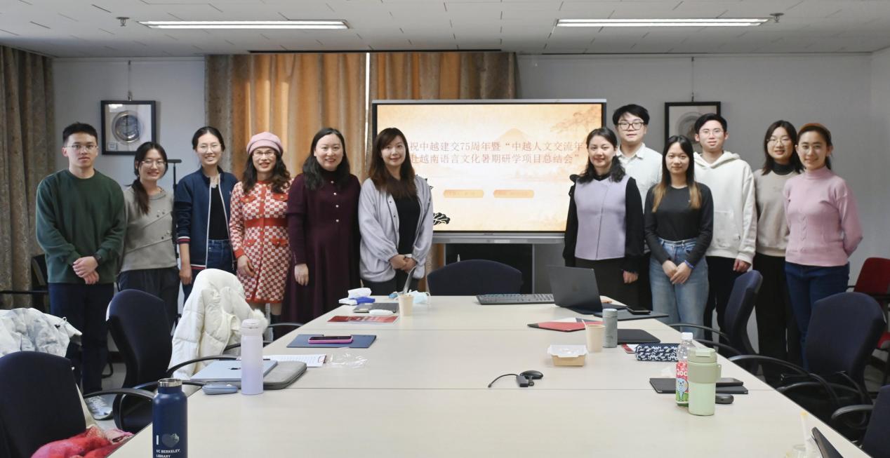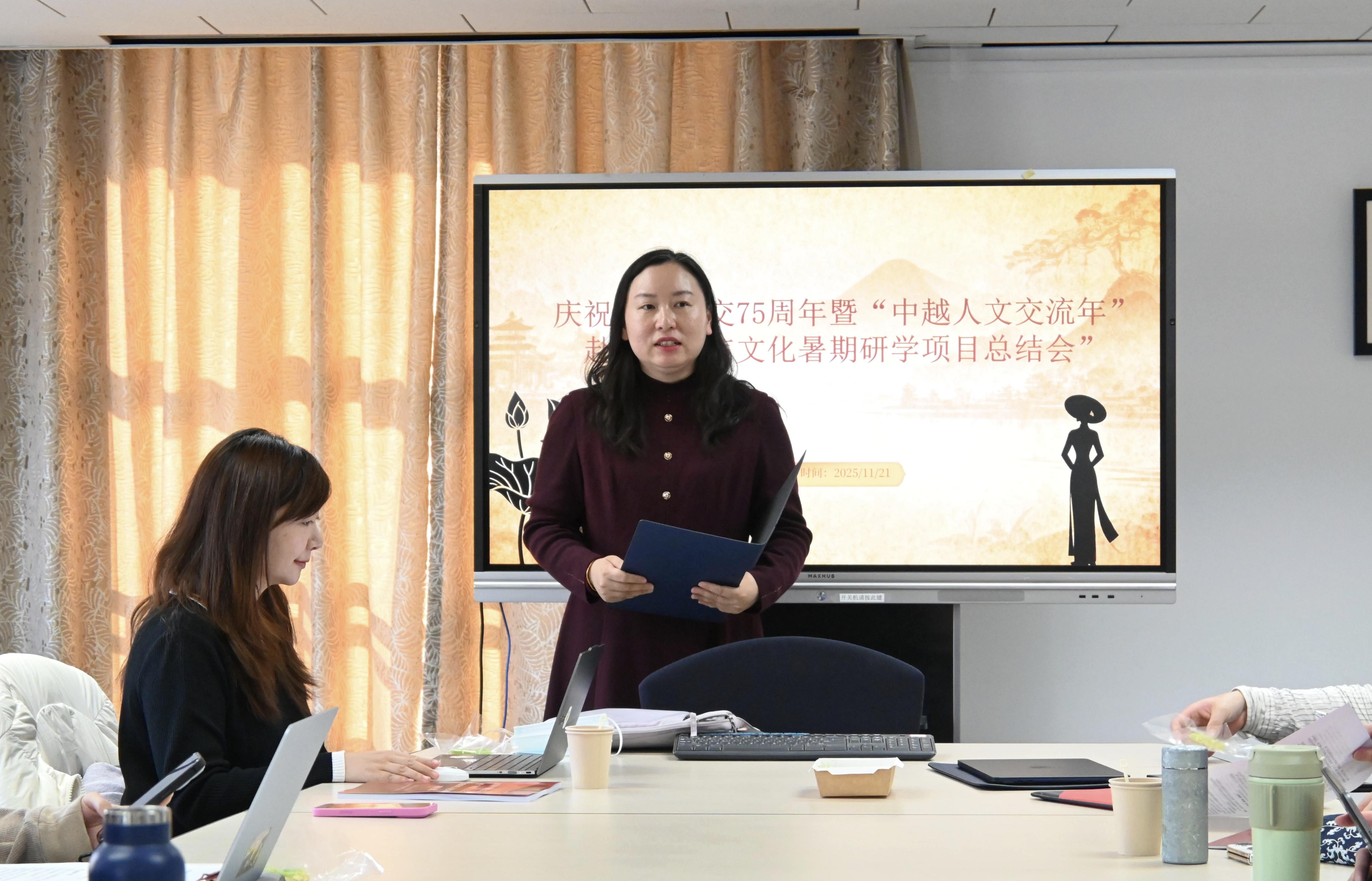 11月21日下午,北京大学外国语学院东南亚系越南语专业召开赴越南语言文化暑期研学项目总结会。外国语学院教务办李卉老师、越南语教研室咸蔓雪老师、夏露老师、越南语教研室主任谢昂老师以及2023级越南语专业全体本科生共同参加活动。总结会由朱俊禹同学主持。2025年不仅是中越建交75周年,也是“中越人文交流年”。在这个重要的背景下,23级越南语专业的同学们在暑期奔赴越南,开展了为期六周的语言文化研学活动。本次总结会既是对暑期学习实践成果的一次集中展示,也是同学们所见、所闻、所思、所感的沉淀,为未来的学习和研究提供新的动力。