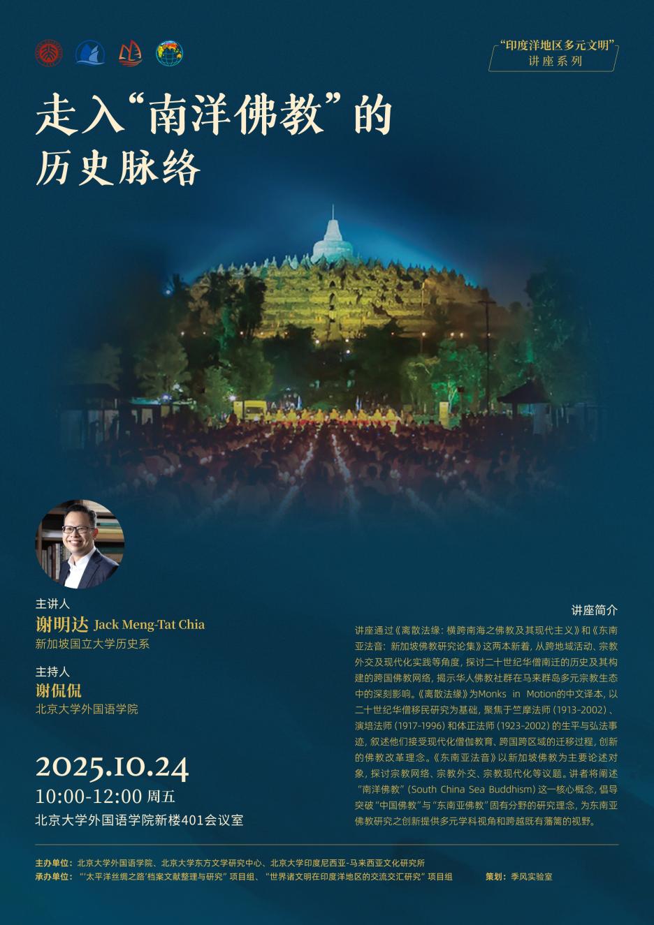 2025年10月24日上午,新加坡国立大学历史系副教授谢明达(Jack Meng-Tat Chia)应邀在北京大学外国语学院新楼401会议室举行题为“走入‘南洋佛教’的历史脉络”的学术讲座。谢明达老师是英国皇家历史学会会士,目前在新国大担任福海佛教研究讲座研究员兼人文及社会科学学院助理院长。