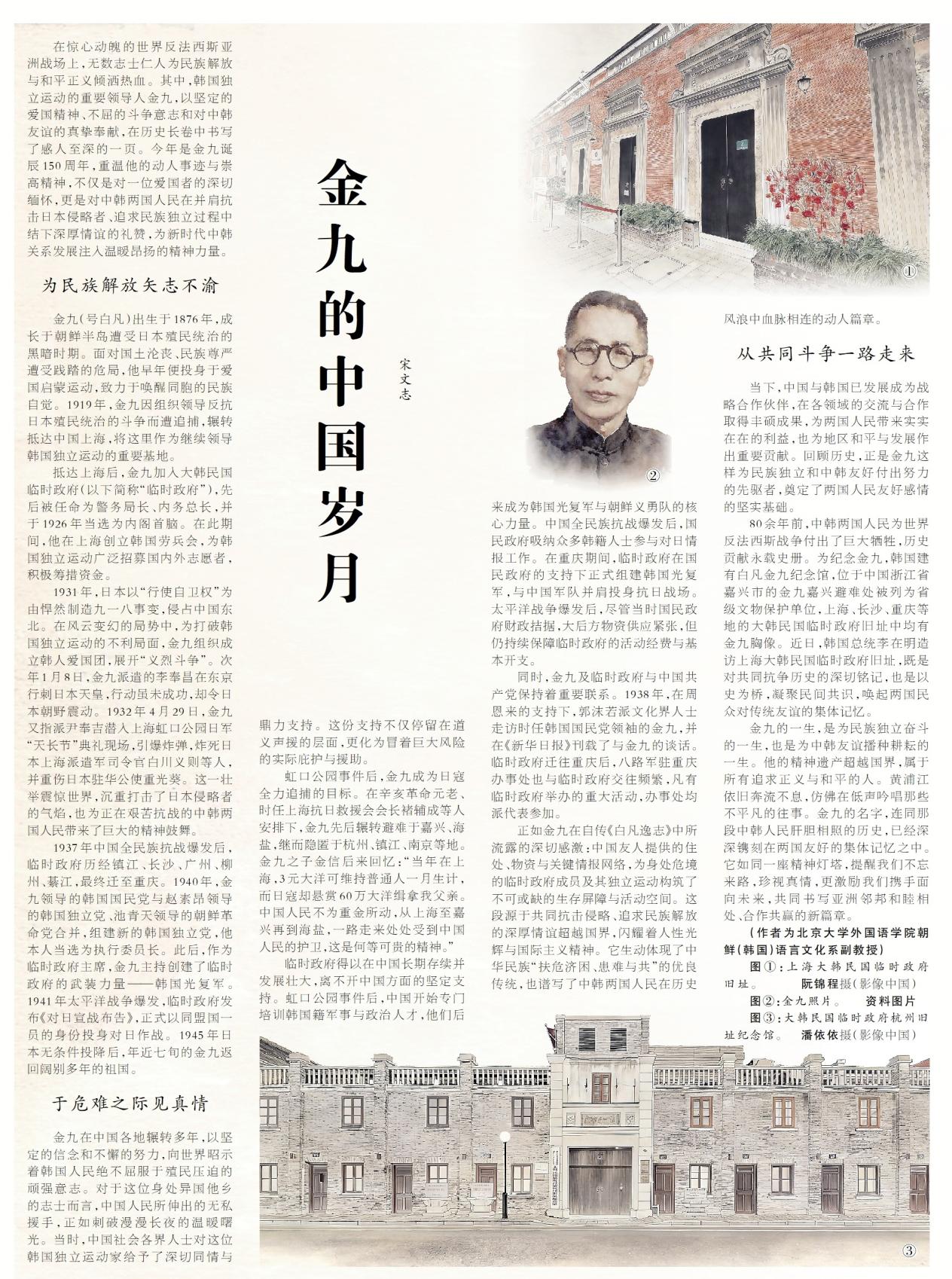 80余年前,中韩两国人民为世界反法西斯战争付出了巨大牺牲,历史贡献永载史册。为纪念金九,韩国建有白凡金九纪念馆,位于中国浙江省嘉兴市的金九嘉兴避难处被列为省级文物保护单位,上海、长沙、重庆等地的大韩民国临时政府旧址中均有金九胸像。近日,韩国总统李在明造访上海大韩民国临时政府旧址,既是对共同抗争历史的深切铭记,也是以史为桥,凝聚民间共识,唤起两国民众对传统友谊的集体记忆。