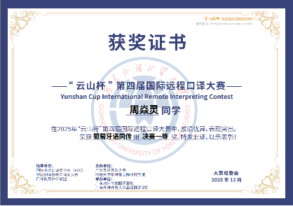 12月20日,第四届“云山杯”国际远程口译大赛总决赛在广东外语外贸大学圆满落幕。北京大学葡语专业大四学生周焱灵在同声传译项目中荣获一等奖(第一名),并在交替传译项目中获得季军;同为大四的佴铭宇在交替传译项目中获得二等奖。两位同学在紧张的竞赛环境中稳定输出、准确传达,展现了良好的临场反应、信息整合与专业表达能力。