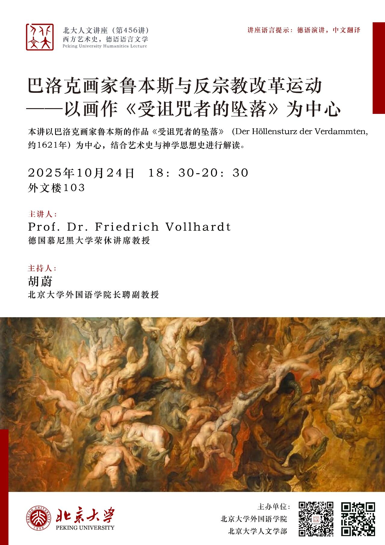 2025年10月24日晚,应北京大学外国语学院德语系邀请,慕尼黑大学荣休讲席教授傅汉德(Prof. Dr. Friedrich Vollhardt)在外文楼103报告厅作题为“巴洛克画家鲁本斯与反宗教改革运动——以《受诅咒者的坠落》为中心”的学术讲座。该讲座为北大人文讲座第456讲,由德语系主任胡蔚老师主持,博士生吕舒婷担任翻译,吸引了校内外众多师生参与。
